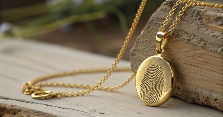 Fingerprint: Der unverwechselbare Fingerabdruck eines Menschen wird in ein Schmuckstück eingearbeitet, der z. B. als Kettenanhänger oder Fingerring getragen werden kann.